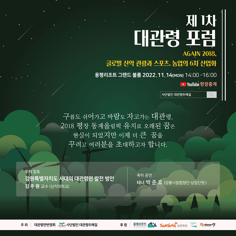 제1차 대관령 포럼 - 글로벌 산악 관광과 스포츠, 농업의 6차 산업화 페이지 정보 작성자대관령두메길 댓글댓글 0건 조회조회 7,717회 작성일 22-11-13 21:31 본문 ... 목록 이전글 2023년 신년인사 및 연회비 입금 안내 23.01.11 댓글목록 댓글목록 등록된 댓글이 없습니다.